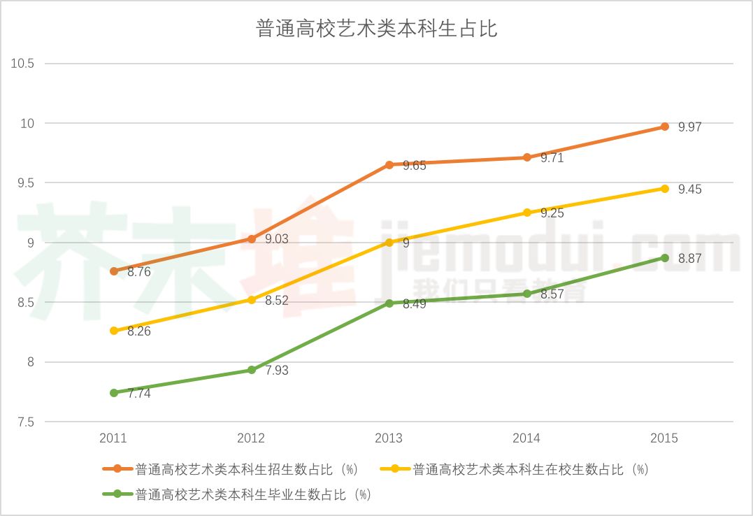 不仅是较高频的素质教育品类,艺术教育对于艺考生而言更是刚需。根据国家统计局、方正研究所的公开资料显示,2011年-2015年,普通高等院校中艺术类本科生占比逐年上升,正走向成熟,近两年处于整合阶段。