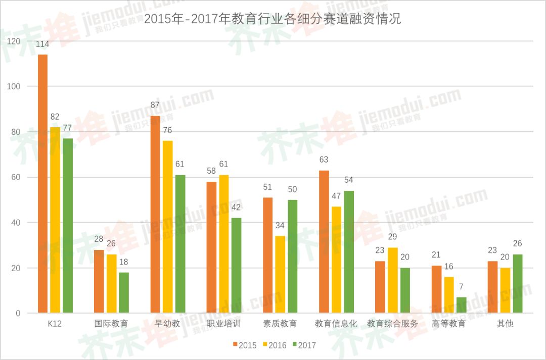在资本寒冬、头部公司品牌效应渐强、模式创新趋于无力等多重因素之下,包括K12、早幼教、职业培训等多个教育细分赛道在融资数量上出现了明显下滑。但素质教育领域在2017年的获投企业数量仍与2015年持平,在整体教育投资中的占比也因而有了不小的上升。