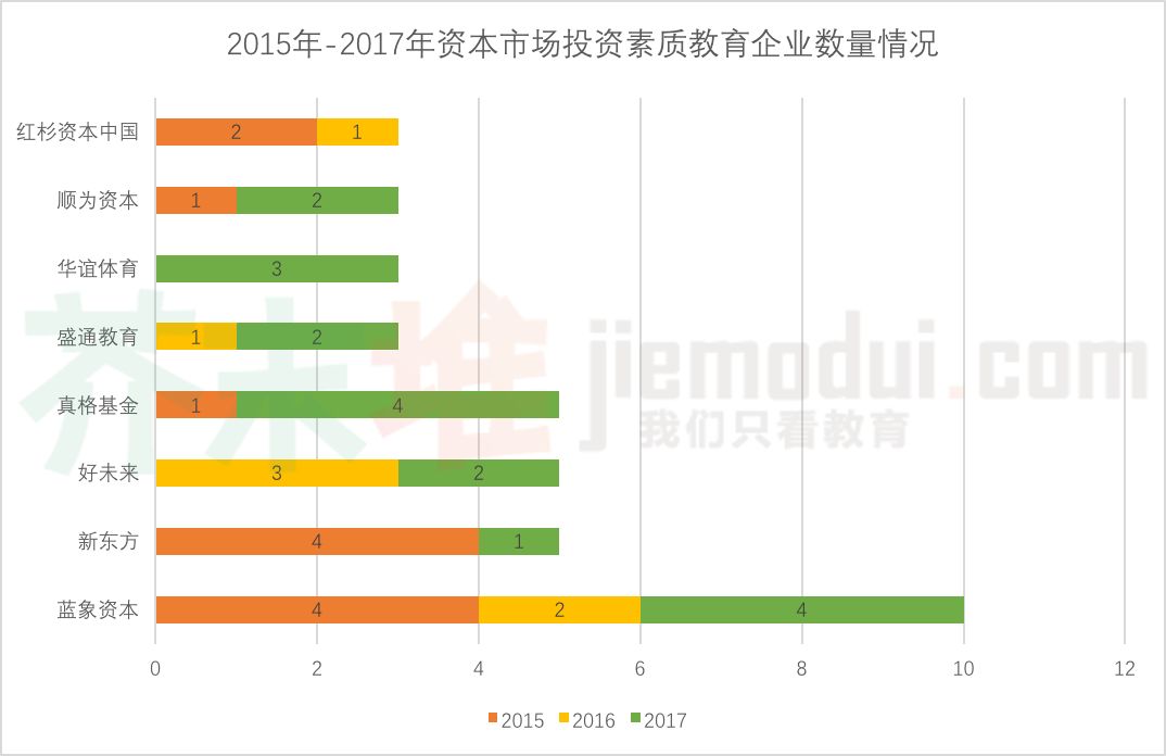 根据统计,与2015年、2016年相比,2017年素质教育行业的融资轮次主要集中在了A轮前后,同时教育企业新东方、好未来及蓝象资本、真格基金等机构对素质教育赛道较关注。